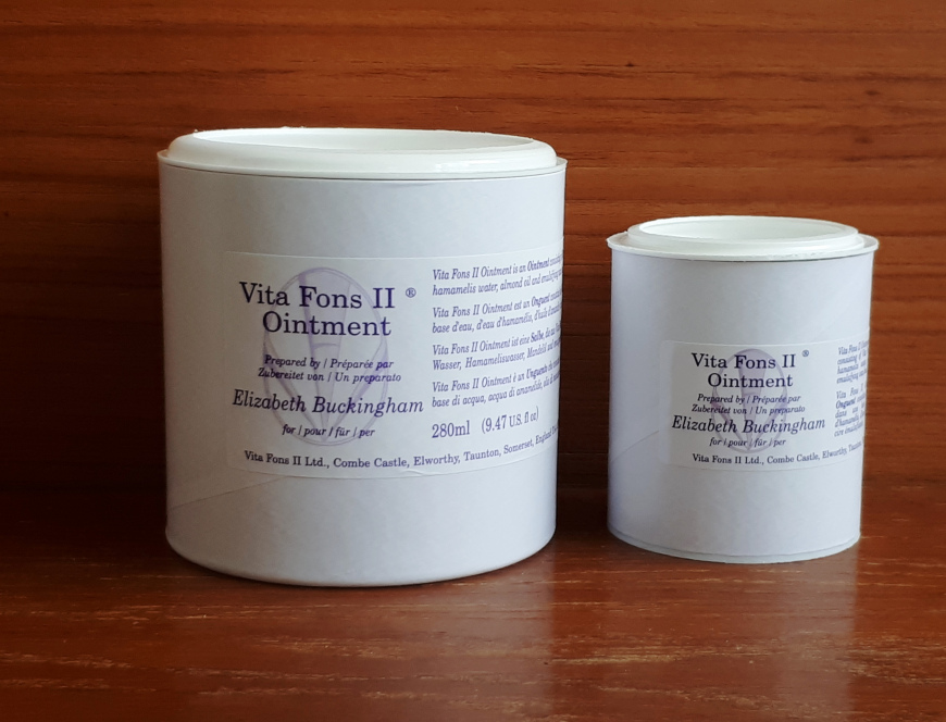 En av Vita Fons mest populära produkter som ofta upplevs ha en särskild kraftfull effekt. Gjord på mandelolja, trollhassel och med vax som emulgeringsmedel. Vid torr hud så kan lotion eller zinksalvan ha bättre effekt. Finns som liten alt stor burk.